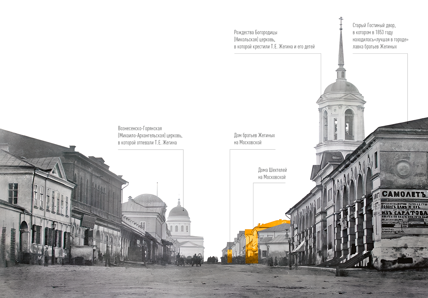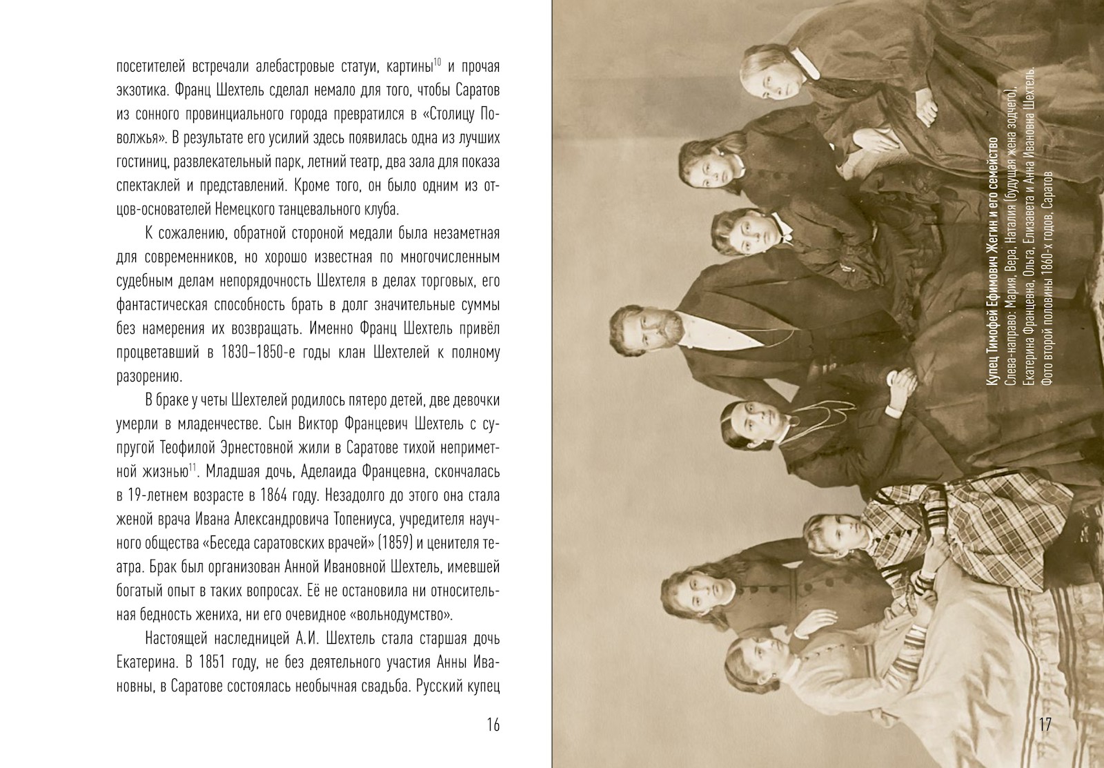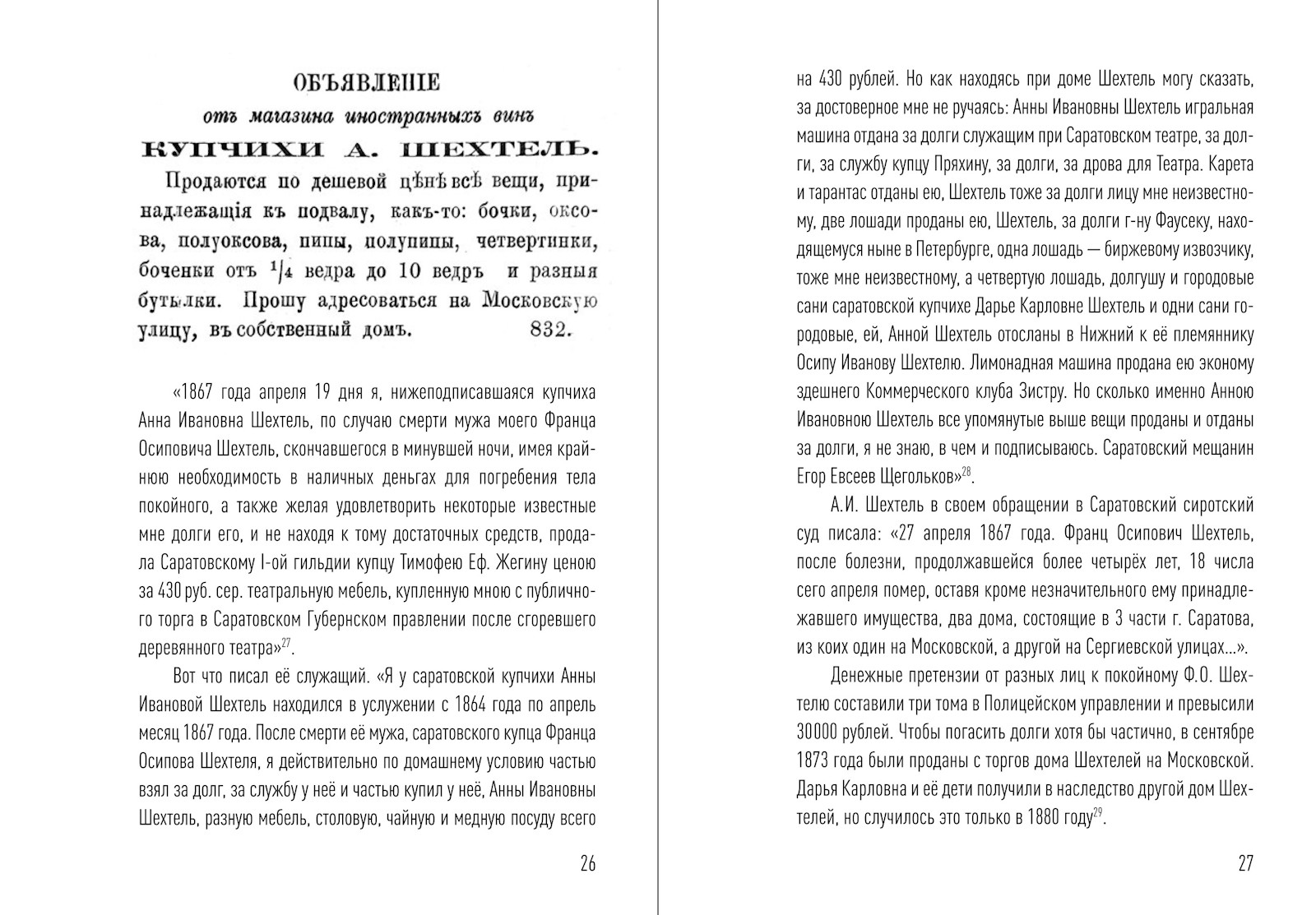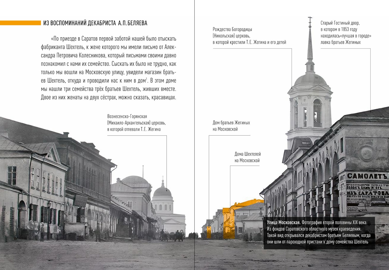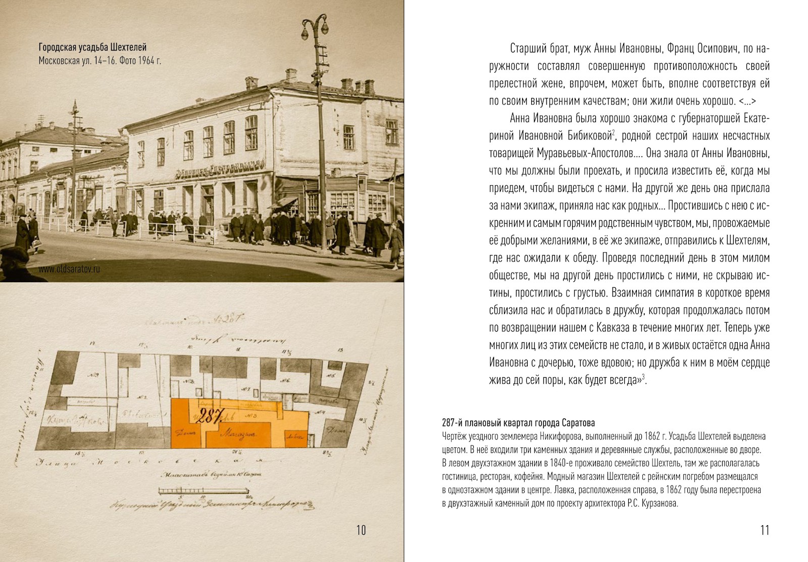 «По приезде в Саратов первой заботой нашей было отыскать фабриканта Шехтель, к жене которого мы имели письмо от Александра Петровича Колесникова, который письмами своими давно познакомил с нами их семейство. Сыскать их было не трудно, как только мы вошли на Московскую улицу, увидели магазин братьев Шехтель, откуда и проводили нас к ним в дом.
