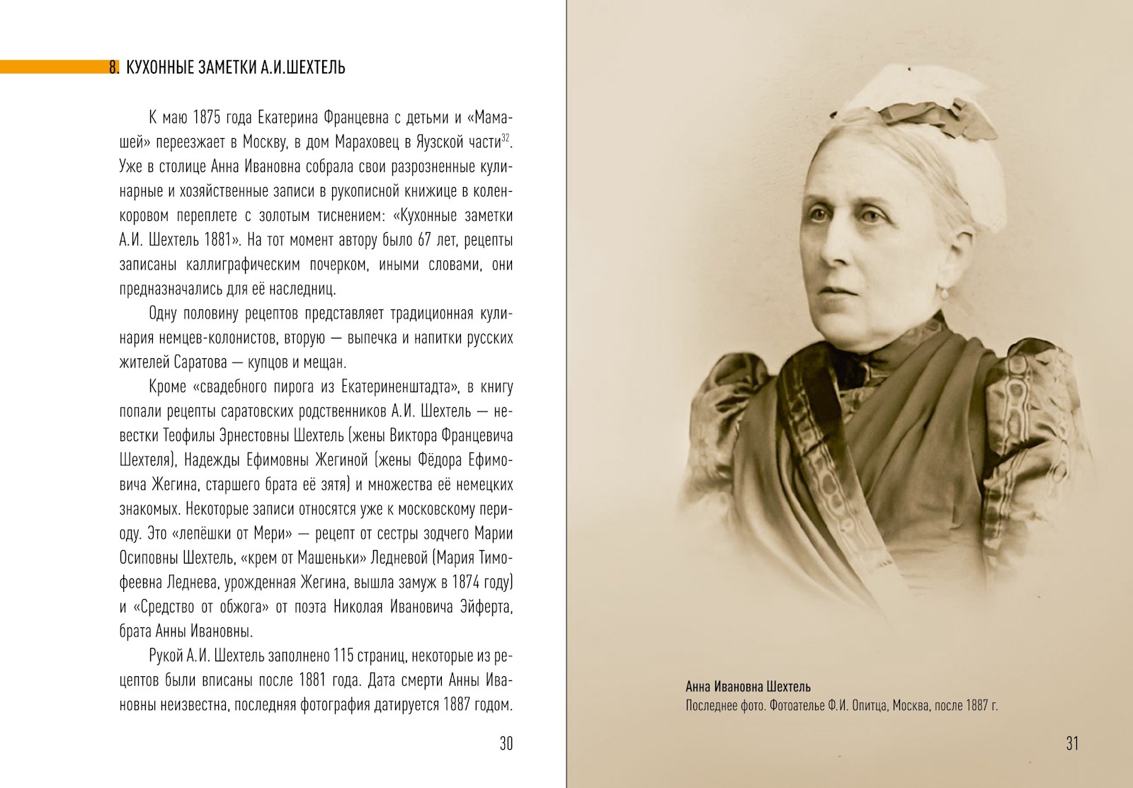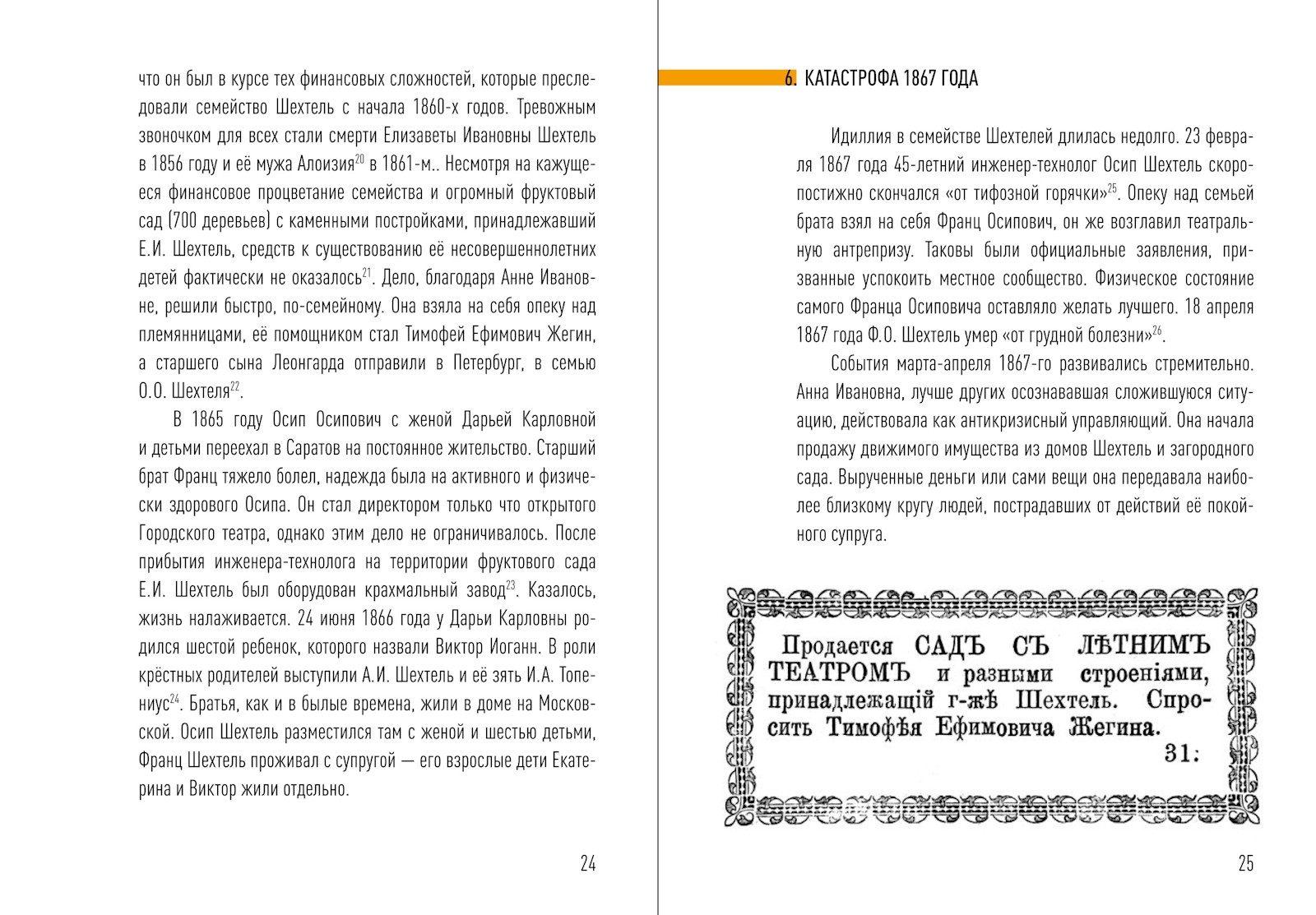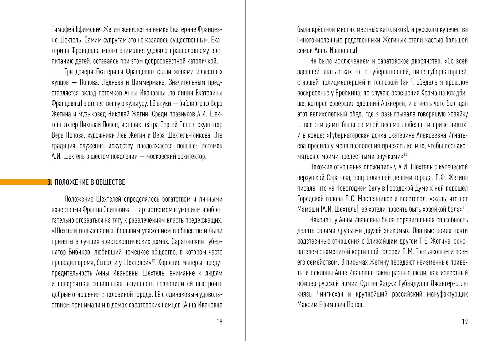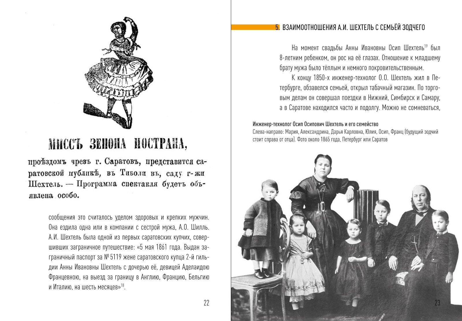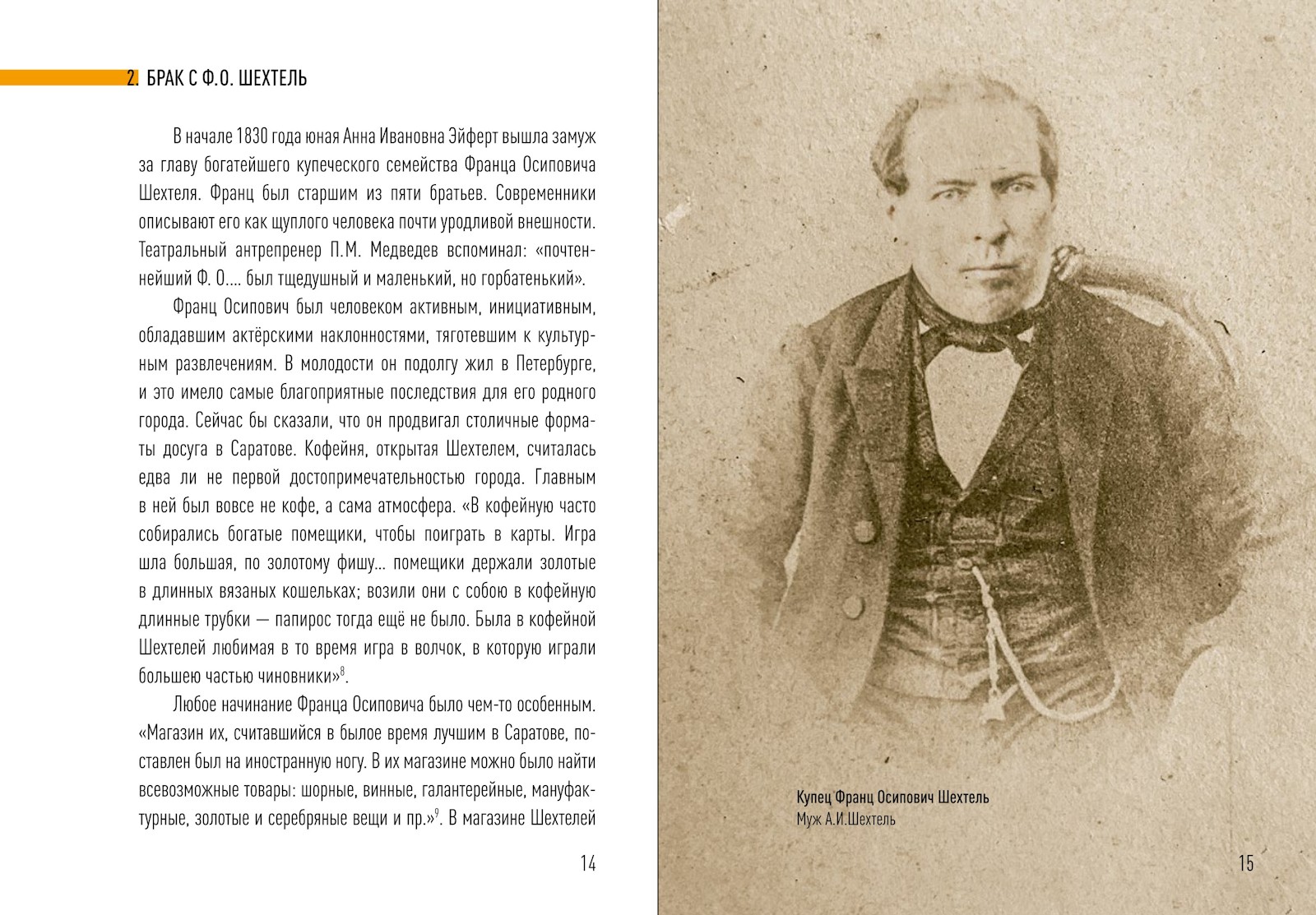 «По приезде в Саратов первой заботой нашей было отыскать фабриканта Шехтель, к жене которого мы имели письмо от Александра Петровича Колесникова, который письмами своими давно познакомил с нами их семейство. Сыскать их было не трудно, как только мы вошли на Московскую улицу, увидели магазин братьев Шехтель, откуда и проводили нас к ним в дом.