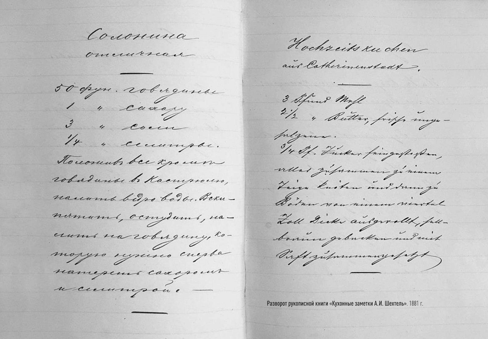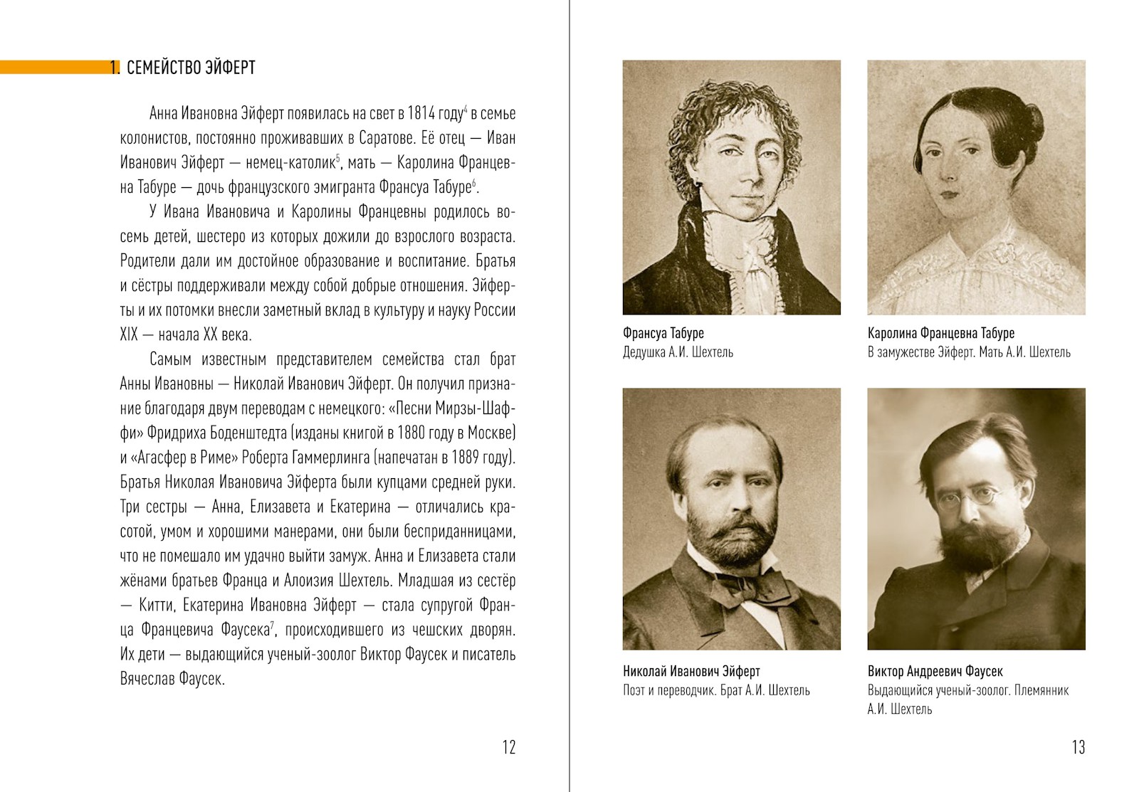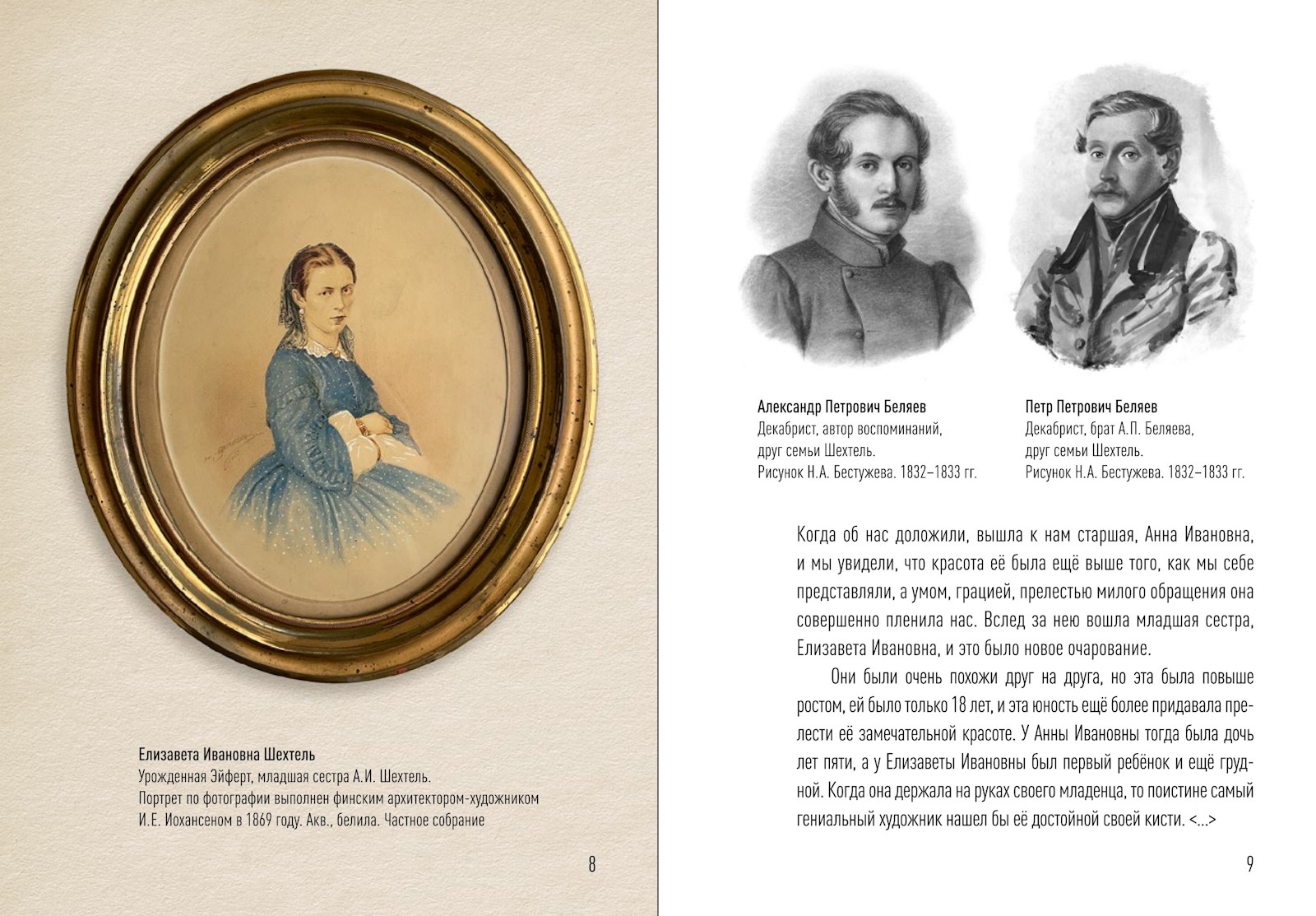 В этом доме мы нашли три семейства трёх братьев Шехтель, живших вместе. Двое из них женаты на двух сёстрах, можно сказать, красавицах. Когда об нас доложили, вышла к нам старшая, Анна Ивановна, и мы увидели, что красота её была ещё выше того, как мы себе представляли, а умом, грацией, прелестью милого обращения она совершенно пленила нас. Вслед за нею вошла младшая сестра, Елизавета Ивановна, и это было новое очарование.