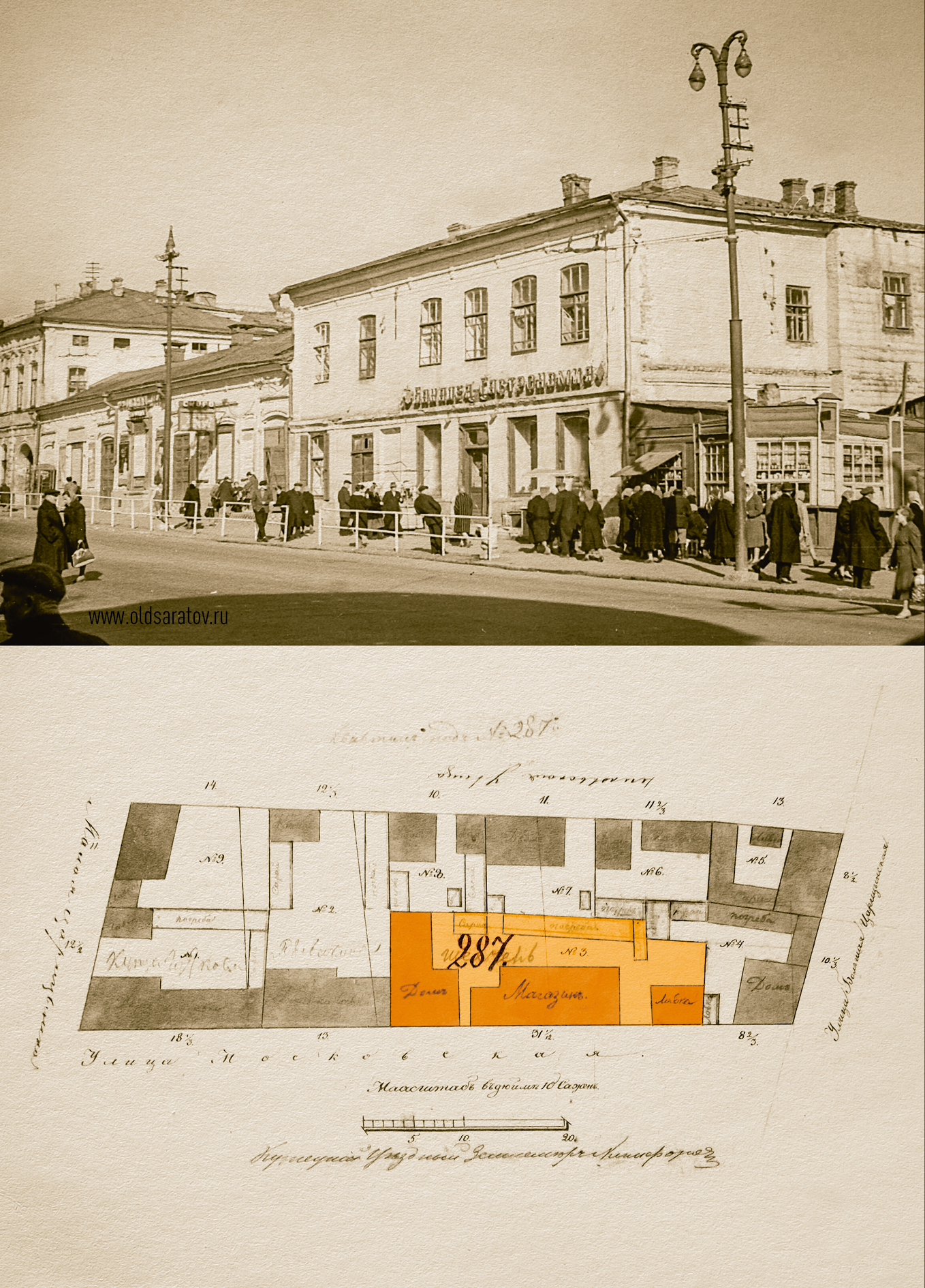 Чертёж уездного землемера Никифорова, выполненный до 1862 г. Усадьба Шехтелей выделена цветом. В неё входили три каменных здания и деревянные службы, расположенные во дворе. В левом двухэтажном здании в 1840‑е проживало семейство Шехтель, там же располагалась гостиница, ресторан, кофейня. Модный магазин Шехтелей с рейнским погребом размещался в одноэтажном здании в центре. Лавка, расположенная справа, в 1862 году была перестроена в двухэтажный каменный дом по проекту архитектора Р. С. Курзанова.