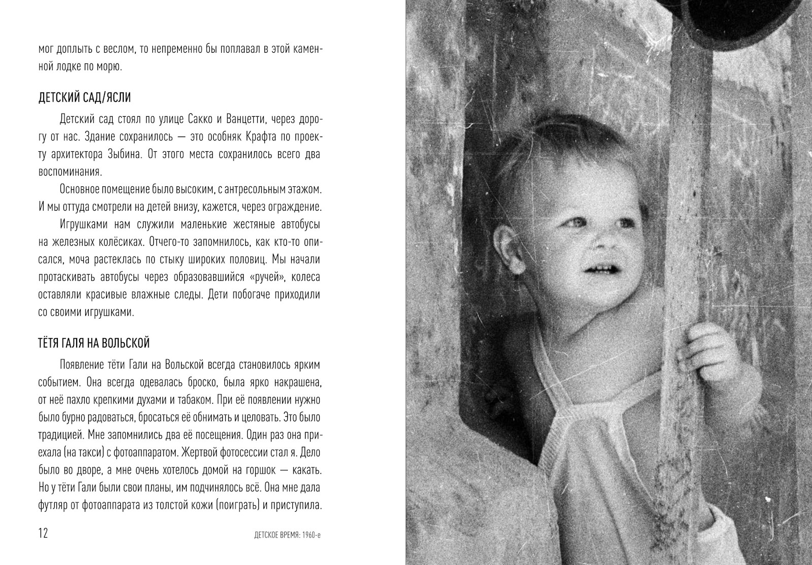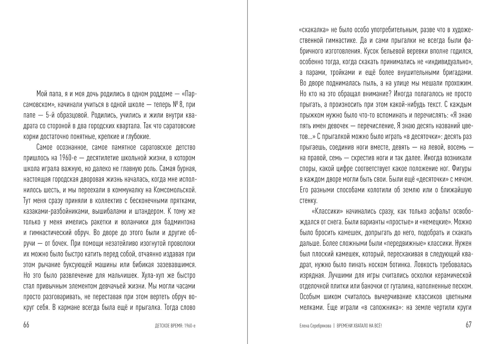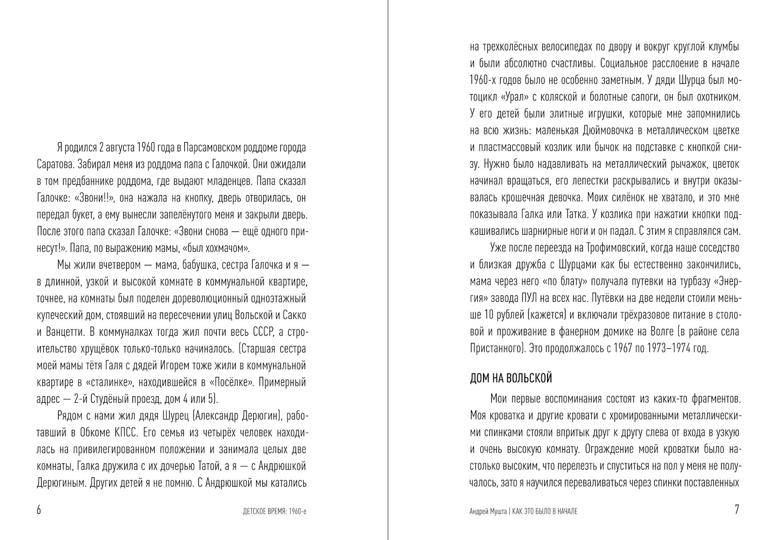 Первой книжке о саратовском детстве выпало быть про 1960‑е. Это время, когда Саратов активно прирастал послевоенной промышленностью. Среди жителей новых районов бытовало устойчивое выражение «поехать в город». Слева направо, если смотреть с Лысой горы на Волгу, — три текста. Мальчишки — один из Ленинского района, второй из Заводского — фланкируют текст девочки. Центральный во всех смыслах — о старом городе.