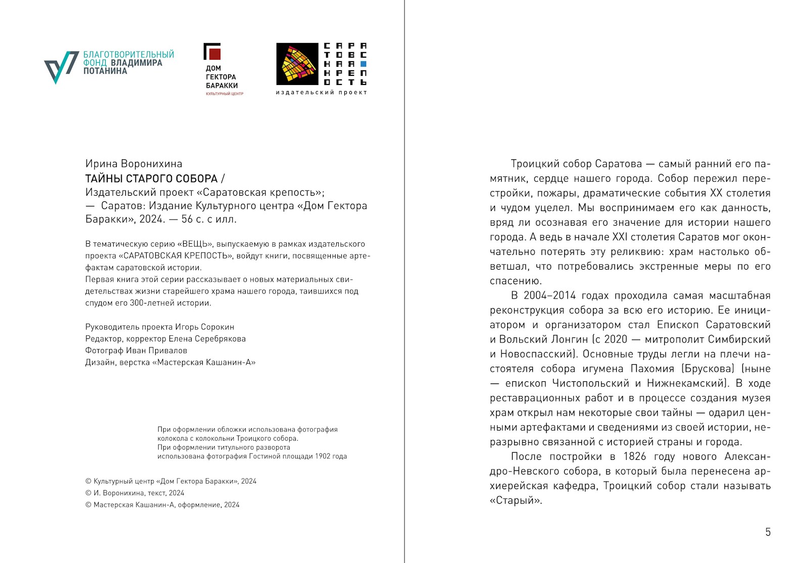 В тематическую серию «ВЕЩЬ», выпускаемую в рамках издательского проекта «САРАТОВСКАЯ КРЕПОСТЬ», войдут книги, посвященные артефактам саратовской истории. Первая книга этой серии рассказывает о новых материальных свидетельствах жизни старейшего храма нашего города, таившихся под спудом его 300-летней истории.